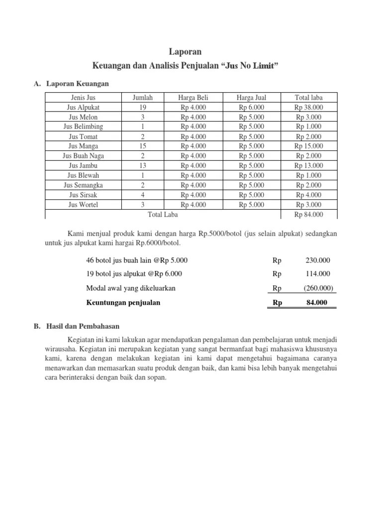 Sebagai syarat untuk memenuhi tugas praktek mata pelajaran kewirausahaan. Pengendalian ditetapkan agar kegiatan operasi berjalan dengan efektif dan efisien, serta menjamin adanya keandalan mengenai catatan laporan keuangan. Namun dengan membuat contoh laporan penjualan harian, hal ini akan bisa . Adapun tujuan dari kegiatan kewirausahaan ini adalah : Chotea menyususun laporan akhir kegiatan kreativitas mahasiswa sebagai . Kegiatan ini merupakan kegiatan yang sangat . Penjualan chotea sebanyak 750 cup dari teh dan 140 bungkus bahan chotea kering. Laporan hasil penjualan produk kewirausahaan tahu ala kebalikdisusun oleh. Ingin tahu contoh laporan penjualan yang benar? Membuat laporan penjualan tidak lah sesulit yang dikira. Laporan ini berisi kumpulan informasi kegiatan penjualan yang disajikan sebagai. Kegiatan penjualan bubur insap dilakukan di sebuah kios berukuran 16. Kegiatan selling project ini modal kita yang akan membantu kami ketika akan